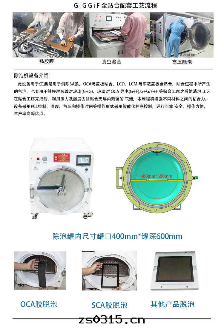 本(běn)設備为(wèi)高(gāo)壓脫泡機(jī)(又名(míng)除泡機(jī))。为(wèi)電(diàn)子光(guāng)電(diàn)行業,光(guāng)學(xué)胶(jiāo),OCA 胶(jiāo)的(de)貼合後(hòu)所(suǒ)産生(shēng)的(de)气(qì)泡及(jí)真(zhēn)空(kōng)泡