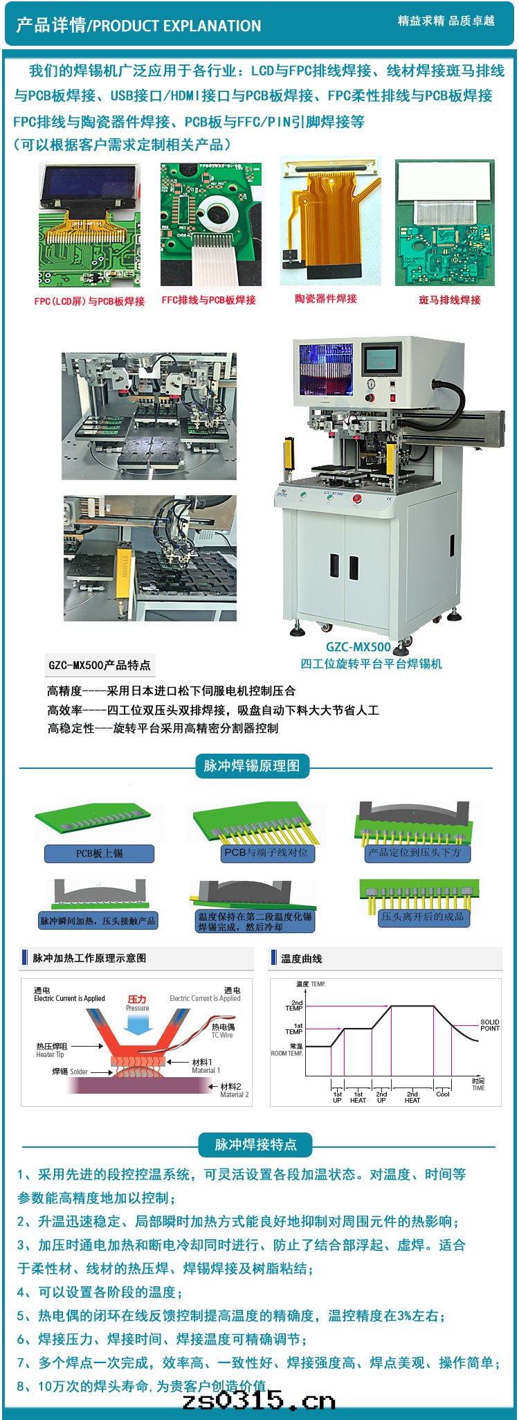 工作(zuò)原理(lǐ)是(shì)通(tòng)过(guò)热(rè)壓头(tóu)上(shàng)加载(zài)的(de)脈沖電(diàn)流来(lái)达(dá)到(dào)瞬間(jiān)升温,使焊锡(xī)以(yǐ)完美(měi)的(de)温度(dù)、时(shí)間(jiān)及(jí)壓力来(lái)与排線(xiàn)焊接在(zài)一(yī)起(qǐ)。
